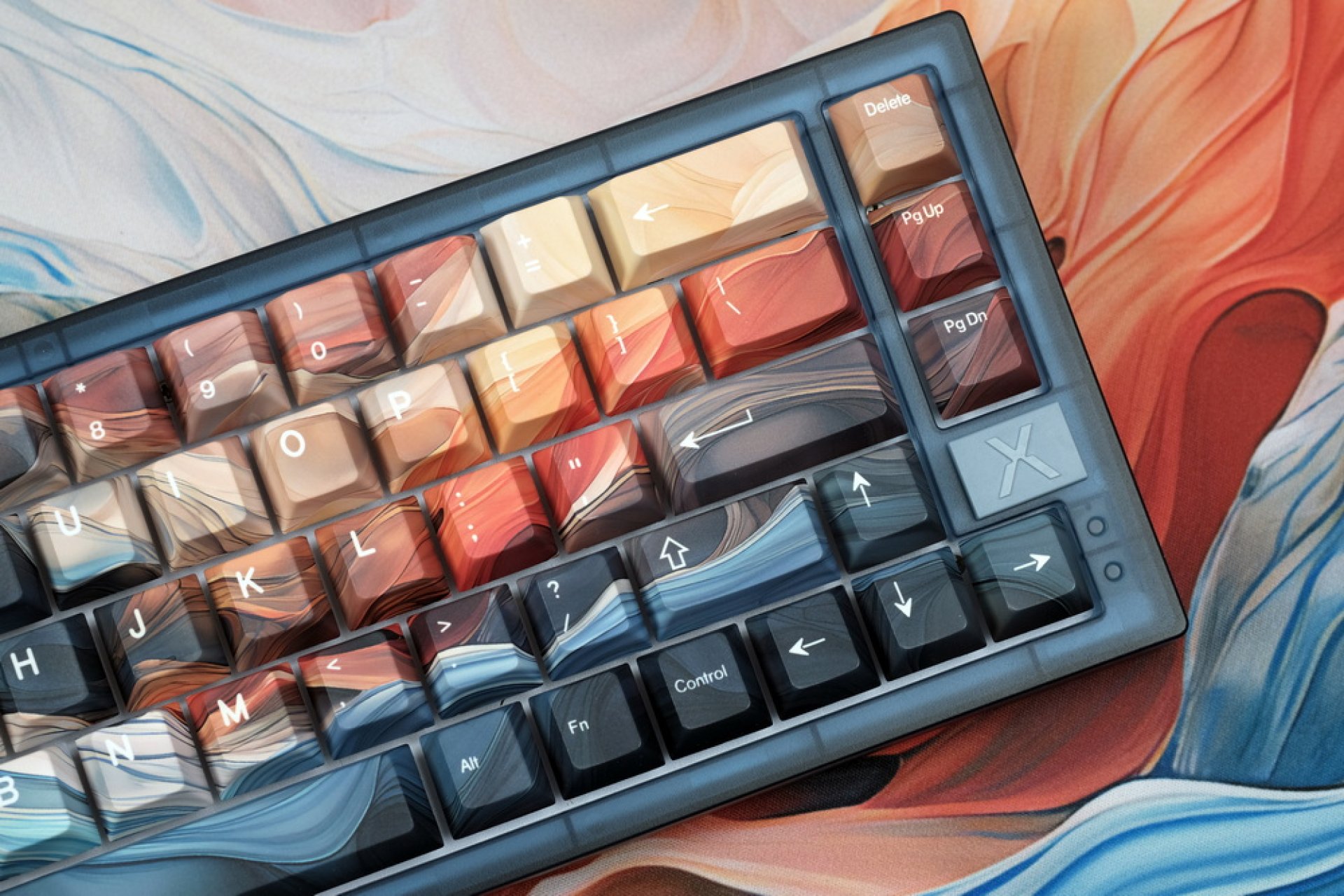 บอดี้ของ K5V2 เป็นสีฟ้า ใสครับ ใสไม่มาก แต่ใสจนพอมองเห็นเครื่องในได้ครับ ส่วนคีย์แค้ปเป็นคีย์ที่มาพร้อมลวดลายเฉพาะตัว ซึ่งพูดได้เลยว่าสวย!!