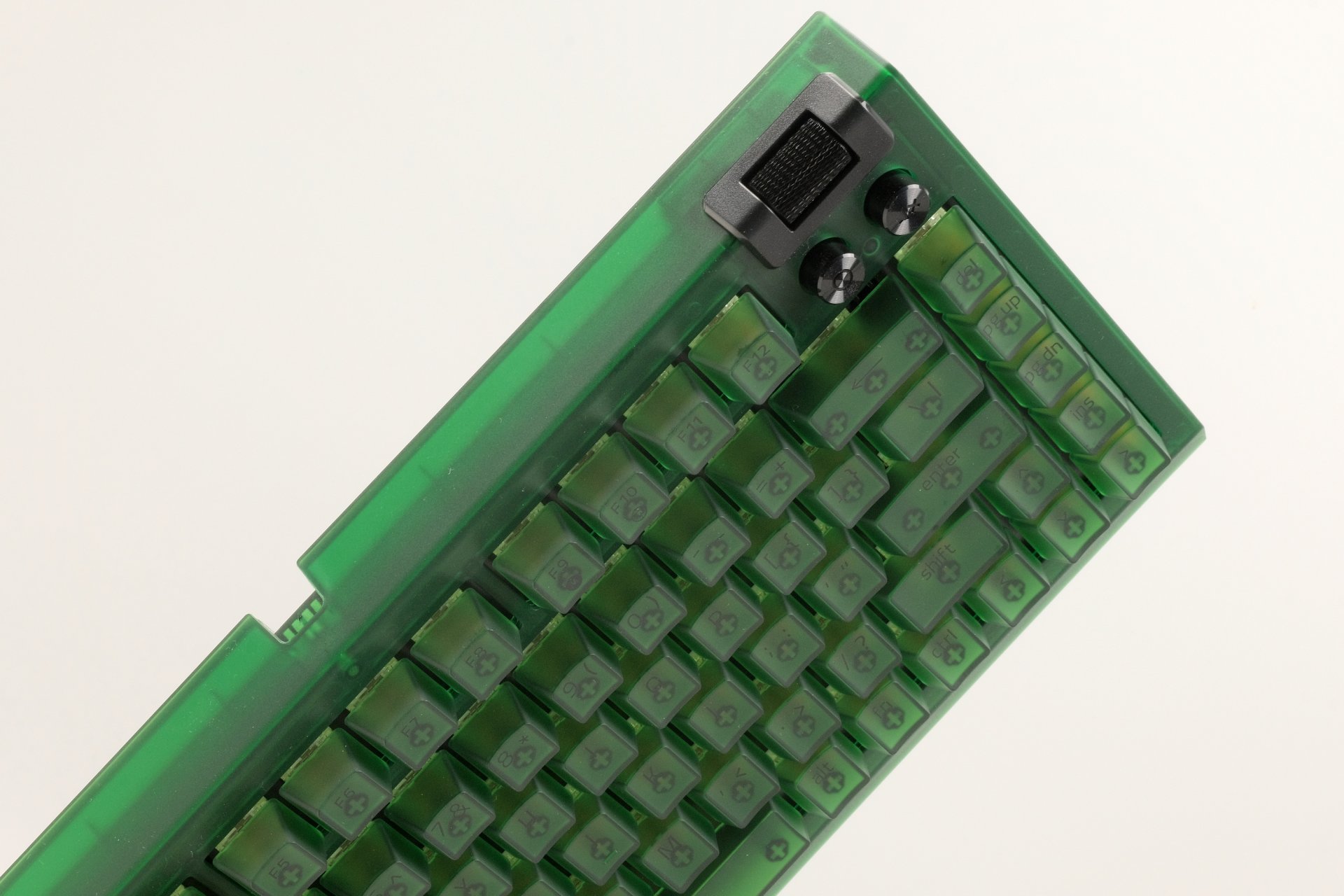 ตัวนี้เป็น Razer Blackwidow V4 75% - Phantom Edition มันคือคีย์บอร์ดแบบแมคคานิคอล ไซส์ 75% ที่สามารถคัสตอมได้นิดหน่อย เปลี่ยนสวิตส์ได้ เพราะเป็น Hot Swap ในส่วนของบอดี้ เป็นพลาสติก สีเขียวใส ผิวสัมผัส matte ... เช่นเดียวกันกับคีย์แค้ปทั้งแผงเป็นสีเขียวใส ผิว matte ครับ